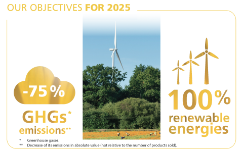 - Reduce our greenhouse gas emissions by 75% (decrease of its emissions in absolute value, not relative to the number of products sold).